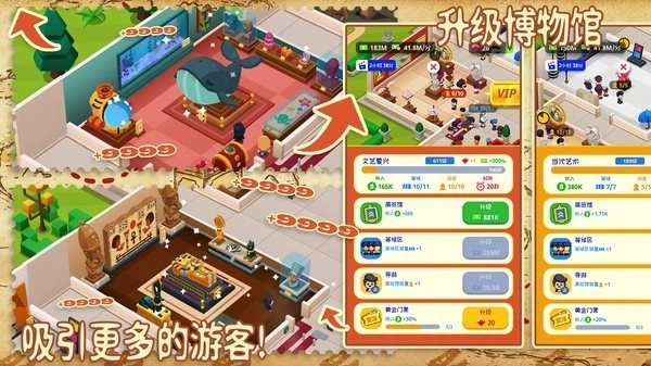 1、玩家可以探索并收集超酷艺术品,升级展览馆,提升管理资源以最大化收益。