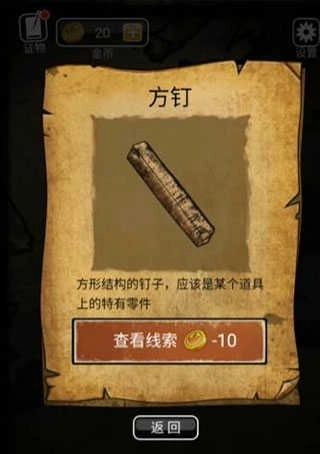 5、一直向右走来到大门前,点击地上的包得到方钉,点击墙上的紫色的花得到折断的花苞。6、在墙上有九个洞的房间当中,点击地上的棍子,将棍子合在一起之后,将刚刚包里面的得到的方钉放到棍子中间得到长棍。