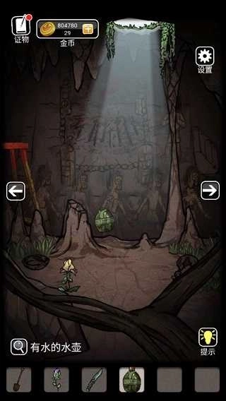 10、点击地上前面收集水的水壶(在一开始放上去的时候不能马上收集,只能等一段时间),向右走来到有壁画的房间,使用水壶浇灌地上枯萎的花,使用长棍捅天上的裂缝。