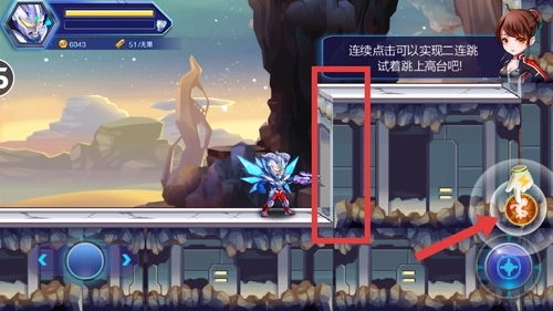 3、要登上高台的话,得连续点击跳跃按钮,按照箭头的指引完成二连跳,这样就能顺利到达目标平台啦。