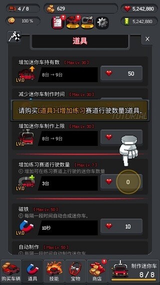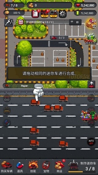点击“制作迷你车”来召集更多同款式类型的迷你车驶向赛道,然后在此前提下,借助两两合并的方法提升你的迷你赛车等级。
