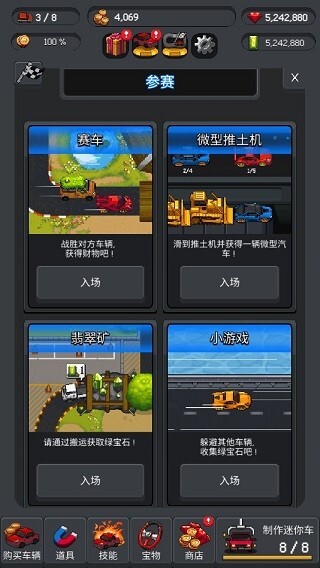 玩家在游戏中无需为汽车支付额外费用,所有资金都可用于升级车辆;游戏画面整体设计简洁,采用像素风格构建场景,能有效避免视觉疲劳问题。