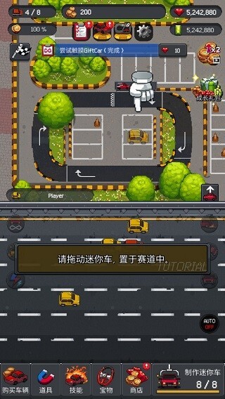 接着把升级合成好的迷你赛车拖到赛道里,开启接下来的放置竞速环节。