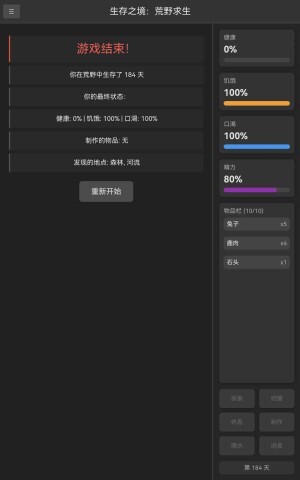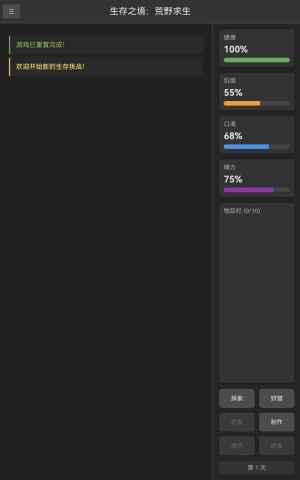 《生存之境荒野求生》是星语工作室推出的一款生存冒险游戏,玩家的健康、饥饿、口渴、精力等生存状态,会以百分比进度条的形式在屏幕右侧展示。游戏里,玩家搜集到的各类资源都将存放在物品栏中,所有相关信息均通过文字来呈现。借助屏幕右下角的选项,玩家能够选择不同的生存行动以获取资源,与此同时,游戏还会记录下玩家的生存天数。