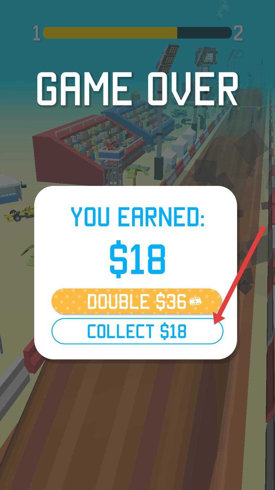 4、当比赛结束后,界面会弹出游戏结束的提示,并且呈现出本次获得的金币数量,你可以点击相关按钮来收集这些金币,以便为下一次比赛做好准备。