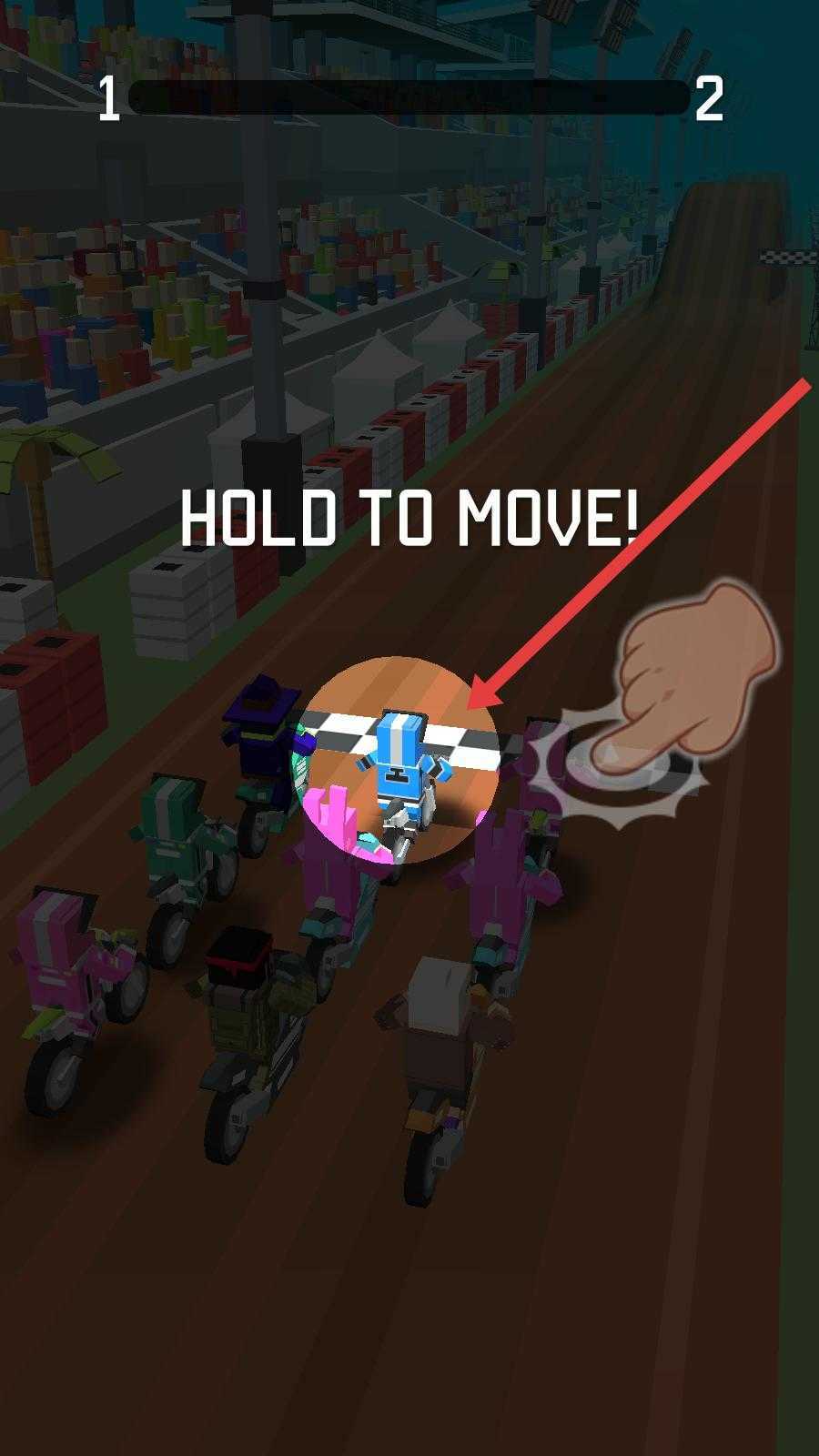 1、进入游戏后,根据提示按住屏幕,操控摩托在赛道上移动,开启摩托竞技之旅,和其他选手展开竞争。