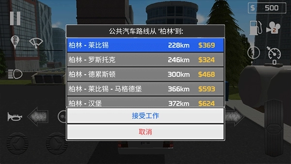 7、接着可以挑选任务地点,不同任务的佣金存在差异,接取任务后,游戏里会自动生成路线指引,你只需按照方向提示驾驶客车即可。