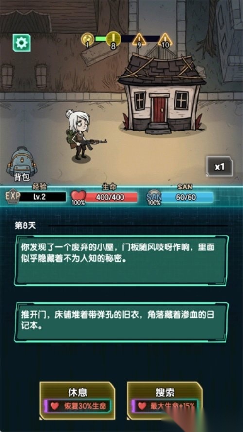 3. 遇到未知房间可以进行搜索或者休息。