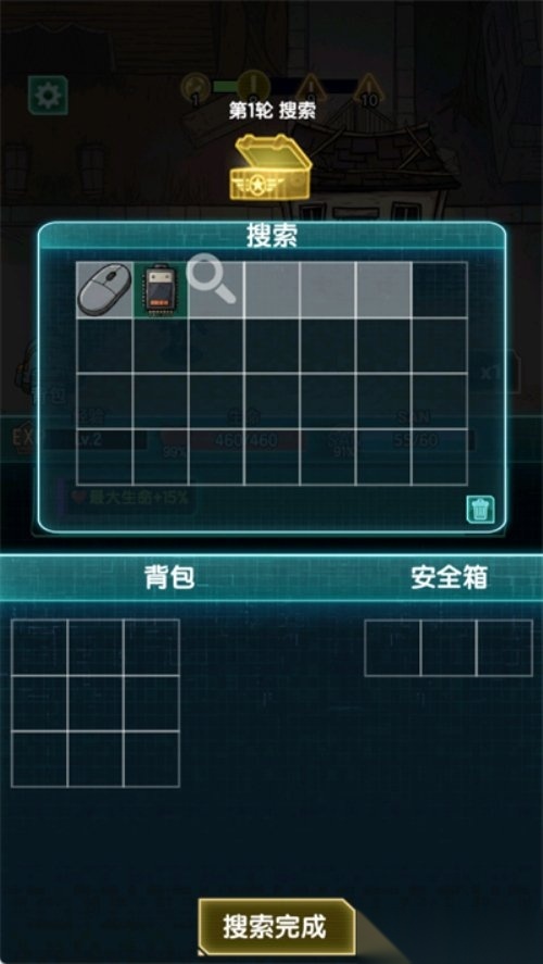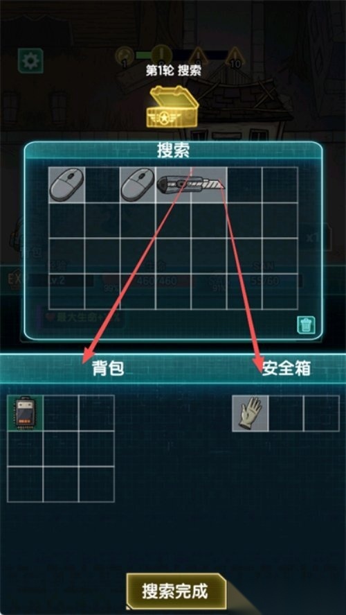 5. 搜索结束后,你可以把找到的物品存放到下方的背包或安全箱里。需要注意的是,安全箱内的物品在角色死亡时不会掉落,而背包中的物品则会在角色死亡时掉落。