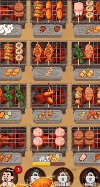 3、食材种类丰富多样,涵盖羊肉串、烤鱿鱼、烤茄子等十余种经典烧烤食材,每款食材都有专属消除特效。