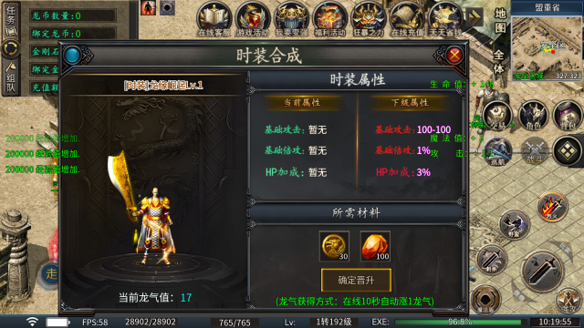 1、时装合成玩法:消耗龙气值与特殊锻造石就能完成晋升操作,每提升一级都能增加攻击、倍攻属性,同时还会获得HP加成。玩家在线期间,每10秒钟就能自动获取1点龙气值。