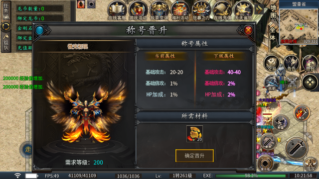 2、称号晋升:消耗称号碎片就能完成升级,称号碎片可通过击杀怪物获取。每次升级都能带来攻击与倍攻的加成效果。