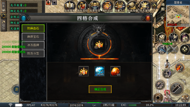 3、四格合成:消耗金刚石与特殊锻造石,就能对防麻血石、麻痹宝石、冰冻盾牌、防冻斗笠这四件四格特殊装备开展合成操作;特殊锻造石可通过击杀怪物获取。