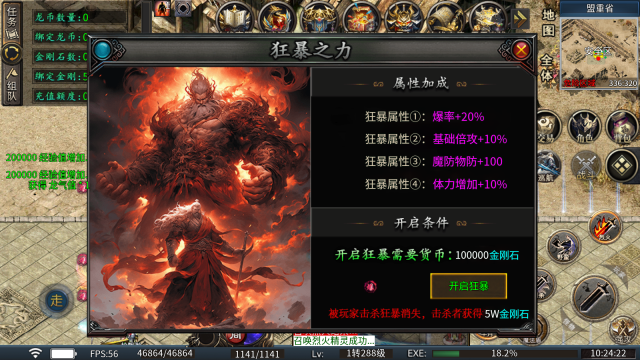 4、狂暴之力:消耗金刚石就能激活,可提升倍攻、魔防、防御属性,同时享有爆率加成。若被其他玩家击杀,狂暴状态会消失,而击杀者将获得5W金刚石。
