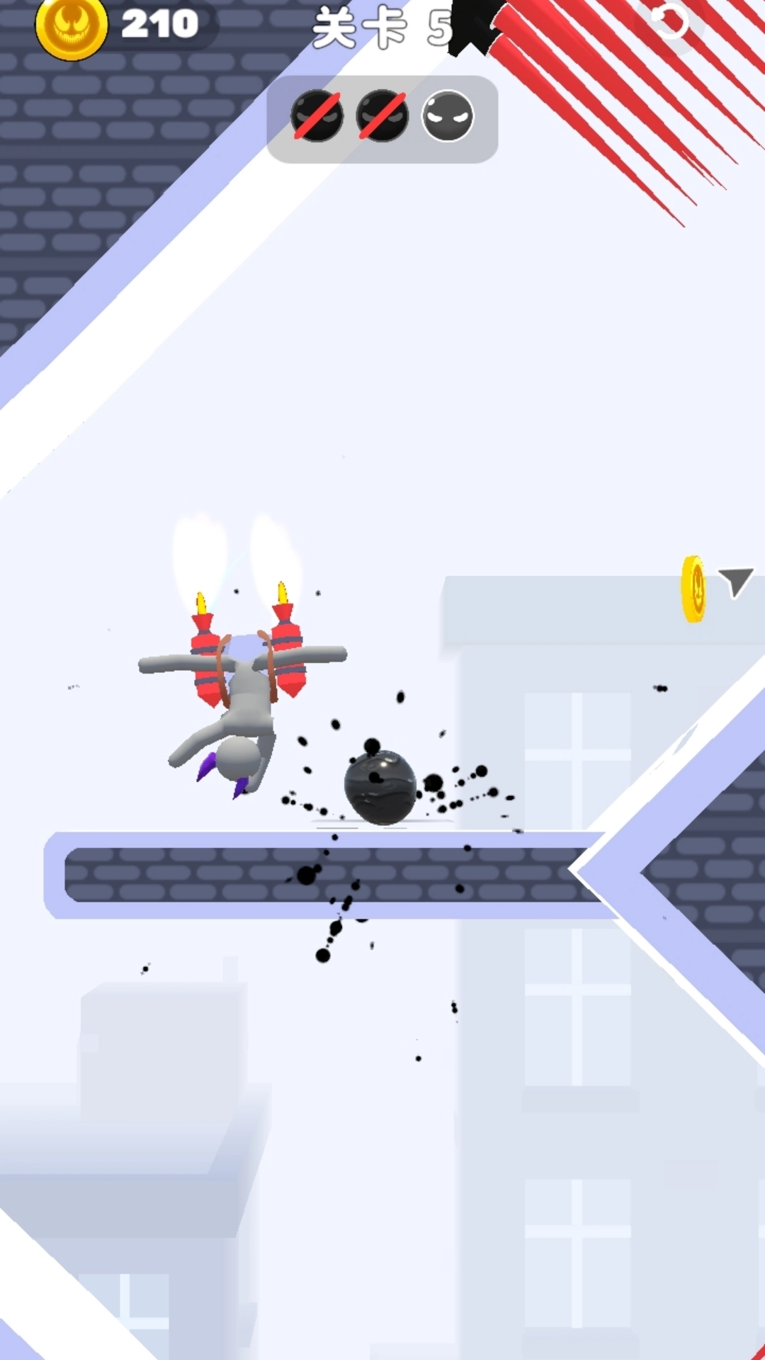 2、弹射过程中击倒敌人时,不同敌人的应对方法存在差异,部分携带道具的敌人需要针对性调整弹射策略,才能更高效地将其击败。