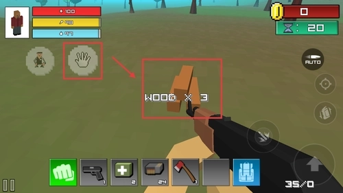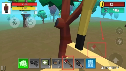 2、开局我们拥有一些基础道具,点击使用物品栏的斧头,对准树木后点击按键进行挥砍,最后就能收集掉落的木材。