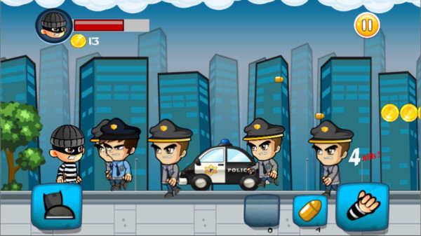 宝宝当警察是一款趣味休闲的闯关类,游戏画风清新可爱,玩法简单有趣,玩家在游戏中扮演一位盗贼,在道路上会有众多的警察出现,而我们要去躲避警察的抓捕,通过跳跃进行躲避,让警察抓捕不到我们,之后我们还能够拾取地图之中出现的金币,从而完成我们的游戏,不断的挑战新的关卡。