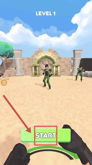 1、点击绿色的START按钮来开启关卡,准备迎击沙地上那些身着绿色军装的敌人。