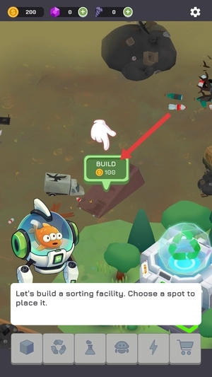 1、进入游戏,点击BUILD花费100金币建造分拣设施,开启清洁工作。