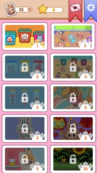 1、选择已解锁的关卡进入游戏,拆解不同主题的储物盒,随机获得普通、稀有或限定款式的家居物品。