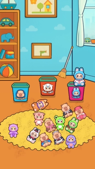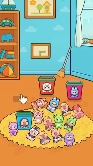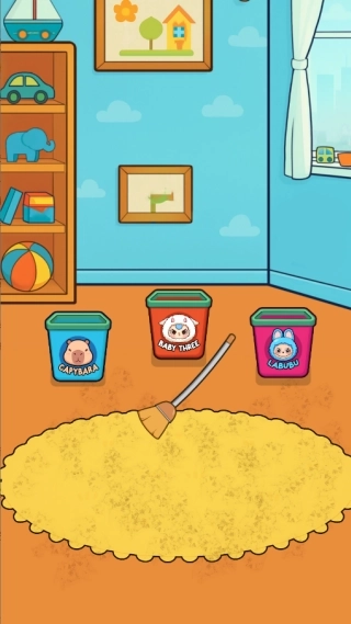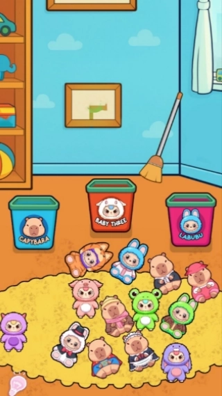 3、在整理关卡时,首先要把地毯上的玩偶依据图案分类,放入对应的收纳桶中,接着用扫把清扫污渍,按照分类清扫的顺序逐步推进。