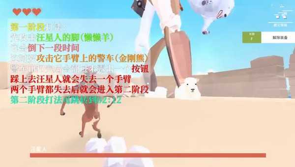 7、第一阶段仅需躲避攻击,攻击它脚上的懒懒羊,等它倒下后攻击其手臂即可。