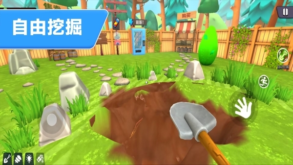 1、玩家从自家院子出发开启刺激的地底探险之旅,手持铲子挖掘隧道、深入地下,探索神秘未知的领域,以此满足内心对地下世界的好奇与探索欲望。