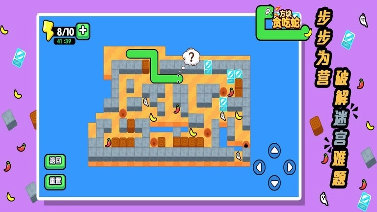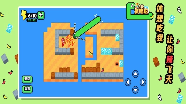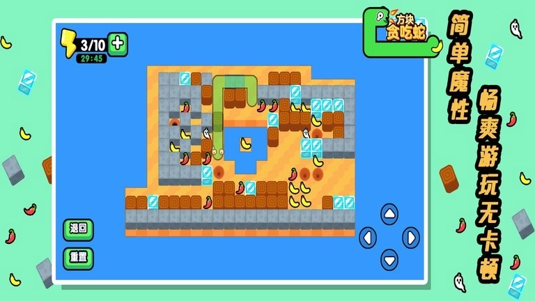 谁说贪吃蛇只能走直线?本作大胆引入“方块化”视觉语言与物理交互逻辑:蛇身由像素方块构成,移动时带有节奏感碰撞反馈;场景随皮肤主题动态切换——辣椒皮肤配火辣红图,吃鸡皮肤带空投降落伞,推箱子皮肤则解锁机关解谜式关卡。障碍物不再只是静止边界,而是可推动、可触发、可利用的动态元素。每一局都是全新体验,每一次刷新都充满未知惊喜。