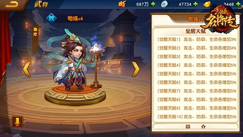 2、武将进行觉醒操作后,其攻击、生命、物防与法防属性均会得到提升;当觉醒进度达到特定阶段时,还能够解锁觉醒天赋,该天赋将以百分比形式进一步增加武将的攻击、生命以及防御属性。