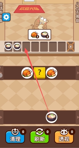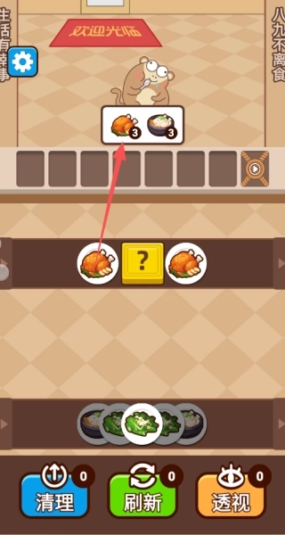 2、游戏围绕消除食物展开,玩家需通过点击来移动食物,将相同的三类食材进行匹配以完成投喂操作,在此过程中还要注意避免卡槽被填满,以免对闯关进度造成影响。
