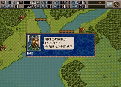 收拾:该操作无需消耗体力,能解除相邻的4支己方部队的混乱状态,但处于沼泽中无阵状态时无法执行。每成功解除一支部队的混乱,可增加100点经验。游戏说明中显示此操作需消耗35点体力,但实际使用时并未扣除(疑似bug)。