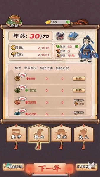 玩家开局身份设定为20岁的世家子弟,将继承90000铜钱并由此踏上创业征程