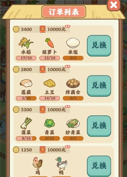 2.查看订单详情步骤:打开订单列表,明确每个任务所需的作物种类及数量(例如:水稻10颗、胡萝卜10颗)。