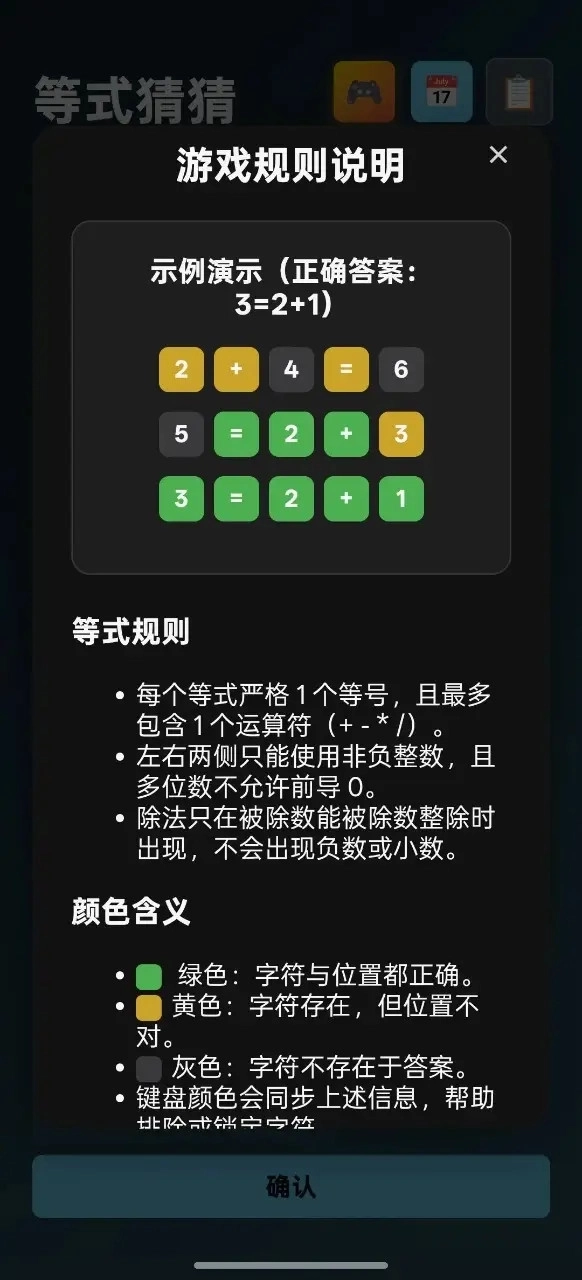 1、每局游戏仅给予6次输入机会,每次提交的必须是语法合法且格式规范的完整等式,系统对缺少等号、符号冗余或无效的表达式不予接受。