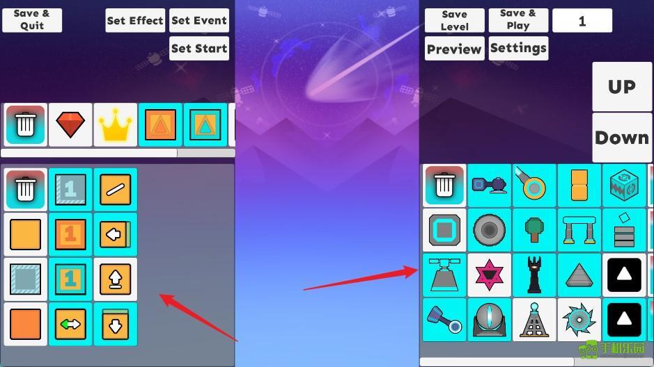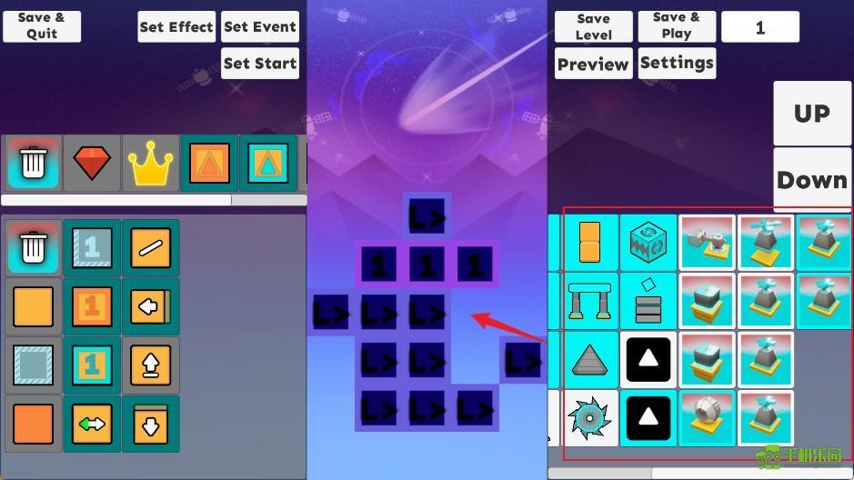 界面左侧陈列着各类地板与奖励元素,右侧则分布着道具与机关,你可以依据自己的创意进行自由组合搭配。