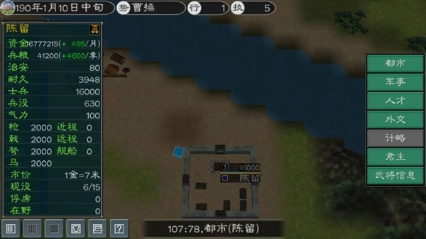 1、刚开始选择曹操势力的时候,建议优先在陈留城修建市场和农场,以此保证资源储备足够充裕;