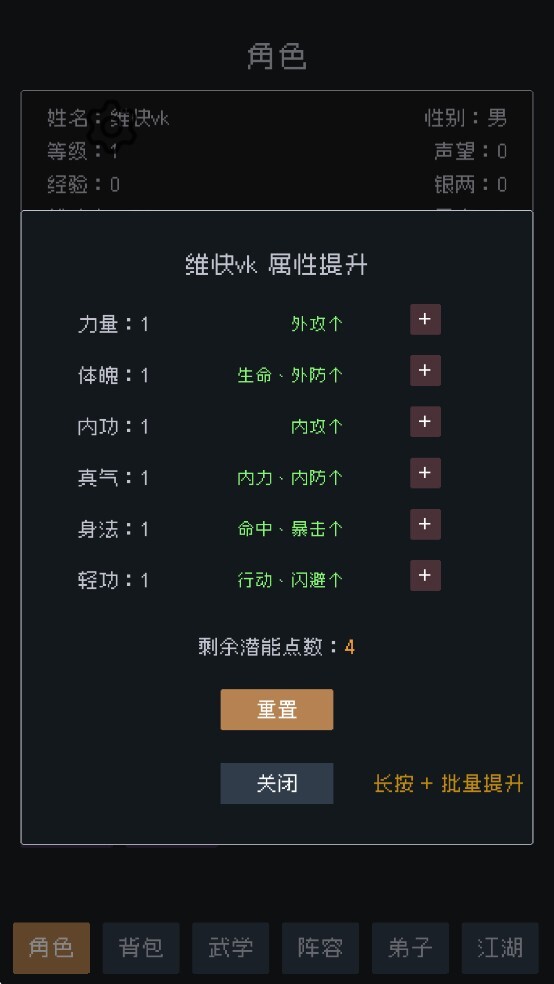 3、作为初涉江湖的新手,你一开始会获得几个可自由分配的属性点;
