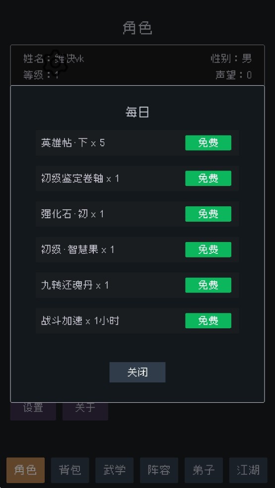 6、在这片江湖之中,你能够开启自动战斗模式,击败敌人后就能获取经验值与金钱奖励,对武侠世界心向往之的小伙伴们,不妨即刻踏上属于你的江湖征程吧!