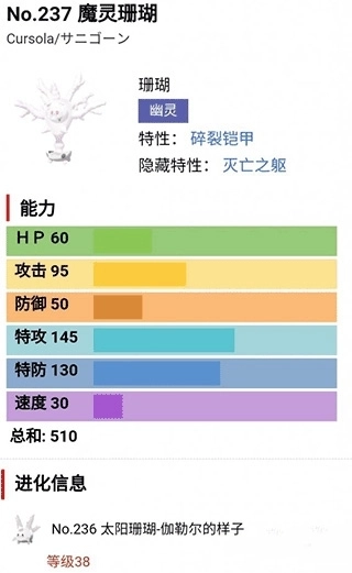 魔灵珊瑚是一个幽灵属性的宝可梦,拥有难以置信的高达145的特攻和139特防属性,可以让强大的敌人在攻击的时,与自己一起进入濒死状态。