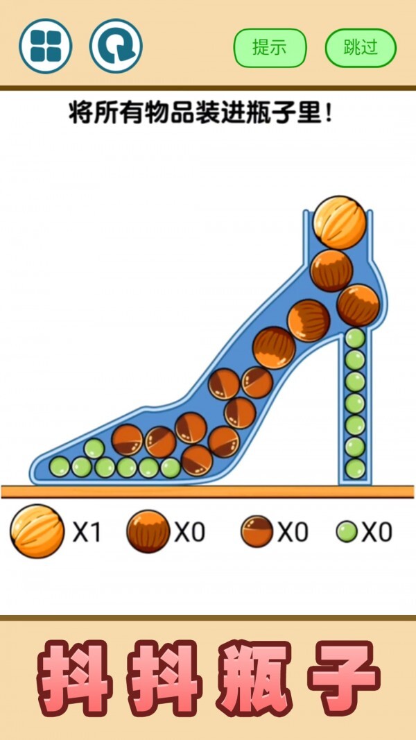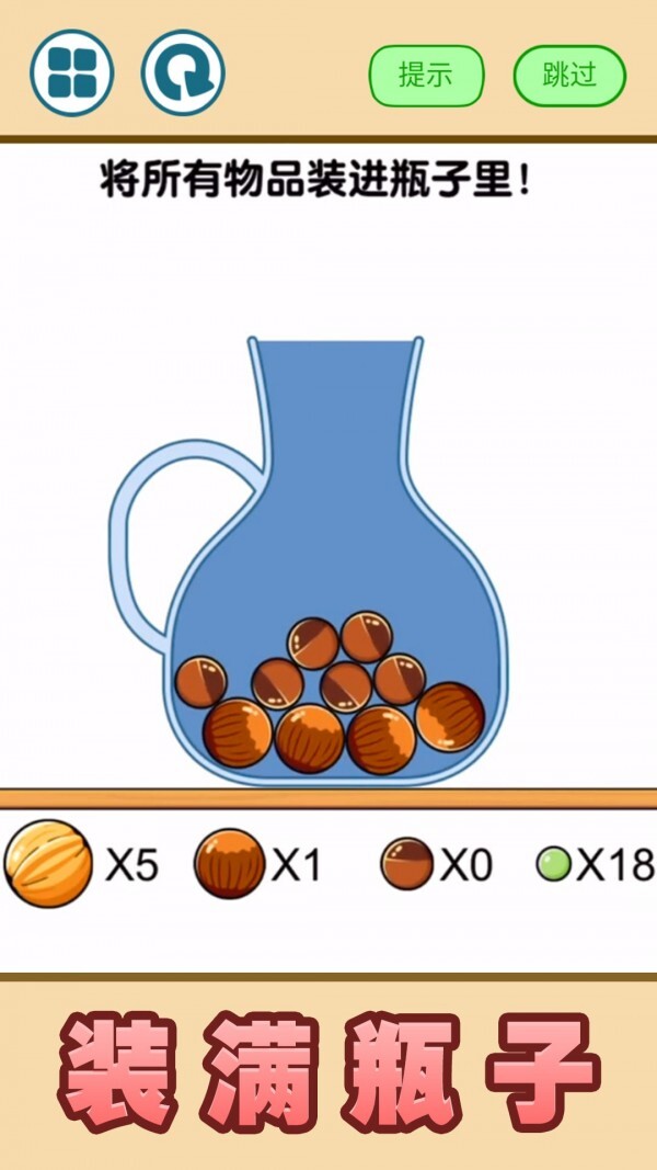 这款游戏玩起来虽然有点费脑子,但玩法挺有意思的,和一些收纳类游戏类似,核心就是把所有给定的物品都装进瓶子里就行。