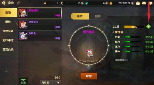 宠物可以给玩家提供额外的属性值(例如图中星光精灵可以给角色提供力量、智力、体力、精神),宠物升级后可以增加给角色提供的属性,提高力量、智力、体力、精神属性,但是每个宠物都有属性上限值(例如图中的宠物满级后只能提供133点力量、智力、体力、精神)。