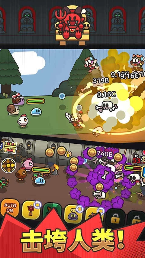 消耗金币就能强化生命、攻击、防御这类基础属性,开启自动战斗功能后,史莱姆会不间断地发起攻击,不需要玩家手动操作。