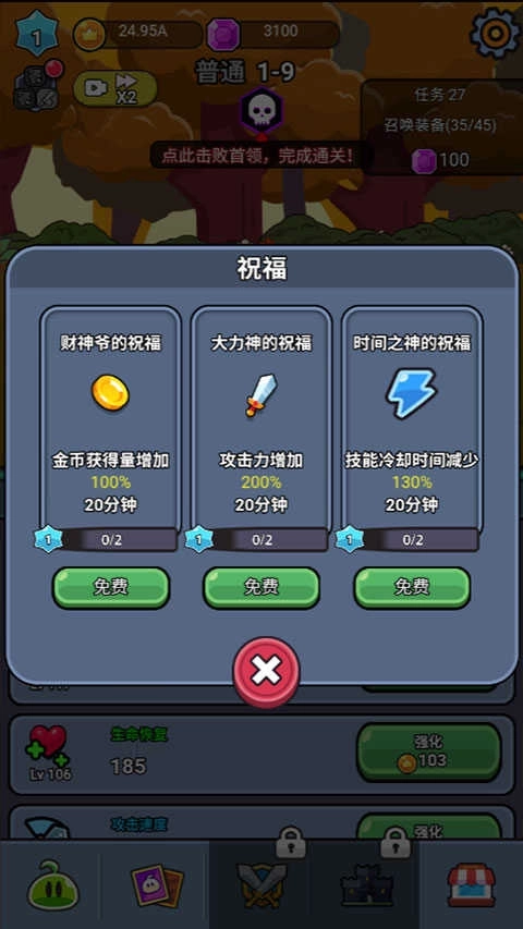 向财神爷、大力神和时间之神祈求祝福,可分别得到金币加成、战力提升以及挂机加速的效果。