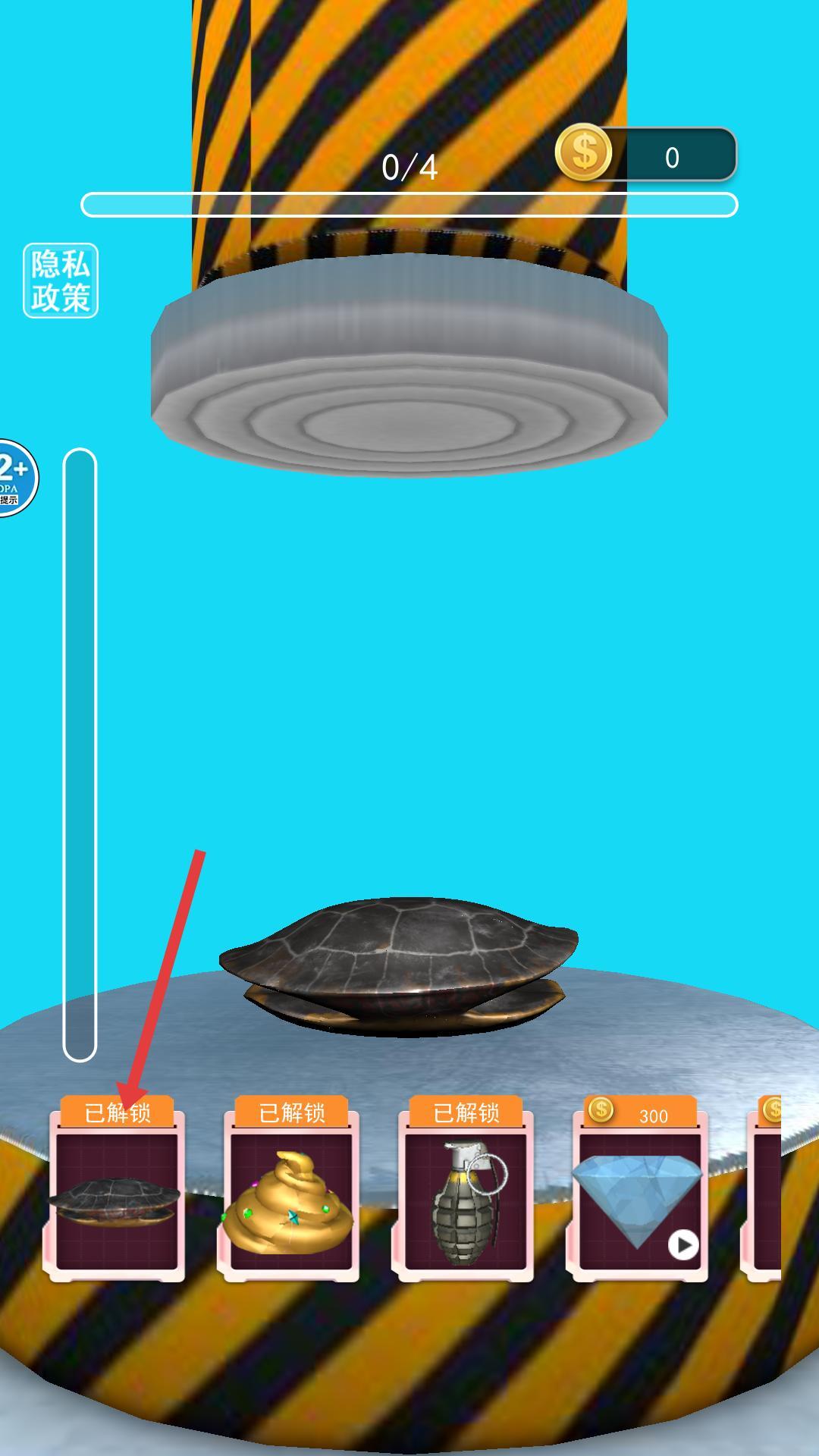 1、挑选已解锁的道具,把乌龟放置在压板上,准备进行压缩操作,注意观察进度条和金币数量,开启解压挑战。
