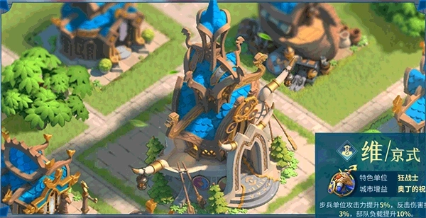 特色单位是狂战士,有奥丁的祝福,步兵单位攻击力提升5%,反击伤害提升3%,部队负载提升10%。维京文明是一个不错的选择,该文明提供步兵单位攻击力提升5%,反伤能力3%以及部队负载提升10%,可以更好的去抢夺他人的资源,来帮助自己发育。不甘愿种田发育,毕竟那样过于佛系,维京文明扫田,撞堡等等都有优势。建筑样貌还算不错。