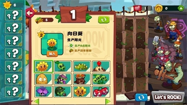 4、进入关卡时需挑选出战植物,通过合理搭配阵容来应对各类不同的僵尸。