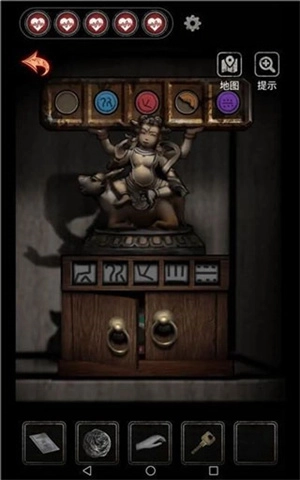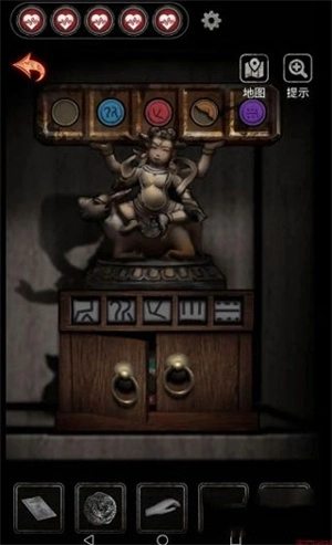 2、2009在2009病房,从高柜深处找到哪吒造型的陶俑,把它和之前捡到的青铜烛台、珐琅怀表一起放在案台上,按照图案的旋转角度来匹配纹样,从而得出四位数的密钥。