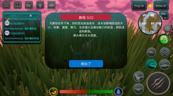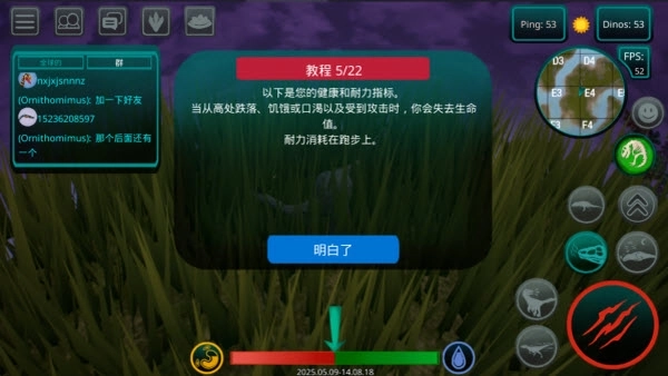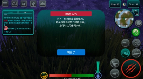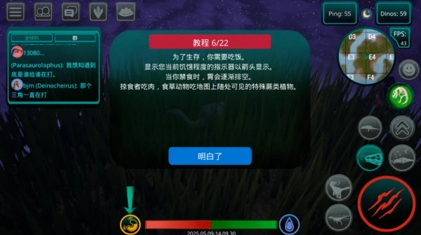 6、要维持生存就必须进食。左下角的饥饿指示器会显示当前的饱腹状态。肉食恐龙需要捕猎其他生物来获取食物,而植食类恐龙则可以啃食地图上分布的蕨类植物。