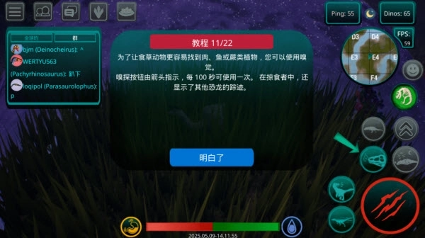 9、嗅觉系统能帮你快速锁定资源。食草恐龙可以用它寻觅植物,掠食者则能循着其他恐龙的踪迹追踪。这个功能每100秒可以使用一次,箭头指向的就是嗅探按钮。