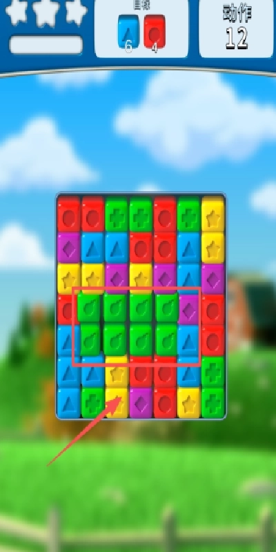 3、观察游戏区域,点击红色框所标注的绿色方块组合,或者留意星级与动作计数,达成方块消除的目标。